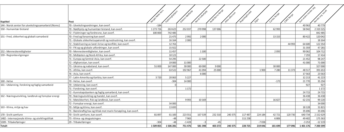 Figur 2.1 Bistand gjennom norske ikke-statlige organisasjoner/stiftelser fordelt på kapittel og post, 20221 (1 000 kroner)