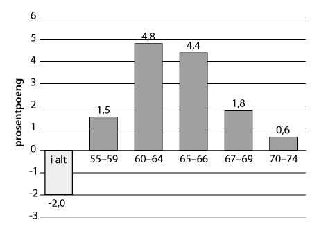Den samlede effekten av trygdeoppgjøret i 2015 og anslått effekt av trygdeoppgjøret i 2016 er anslått å utgjøre om lag 10,8 mrd. kroner for 2016-anslaget, hvor anslagsvis 5,6 mrd. kroner utgjør effekten av trygdeoppgjøret i 2016. Antatt lønns- og prisvekst for 2016 utgjør om lag 1,45 mrd. kroner av økningen fra Saldert budsjett 2015. Til sammen utgjør dette om lag 12,3 mrd. kroner. Utenom lånetransaksjoner innebærer dette en økning i bevilgningene eksklusive G-regulering, lønns- og prisvekst på om lag 7,5 mrd. kroner eller 1,8 pst. Økningen skyldes i hovedsak økte utgifter til alderspensjon og dagpenger.
