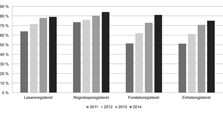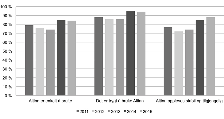 Siden Altinn ble innført i 2003, har antallet innleverte elektroniske skjemaer stadig økt. I 2014 ble om lag 36,1 mill. transaksjoner sendt via Altinn. Her ligger vi langt foran de fleste andre land. Nær 100 pst. av selskaper og næringsdrivende benytter i dag Altinn til offentlig rapportering. Næringslivet har rapportert årlige kostnadsbesparelser på mer enn 1 milliard kroner som følge av digitaliseringen av tjenester. Med økning i transaksjonsvolumer har også kostnaden per transaksjon for forvaltningsorganene med tjenester i Altinn blitt redusert, jf. fig. 4.4.