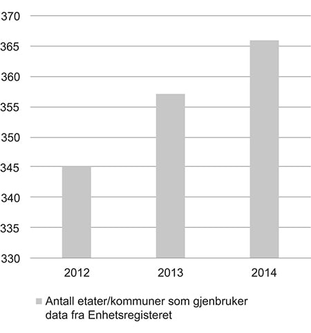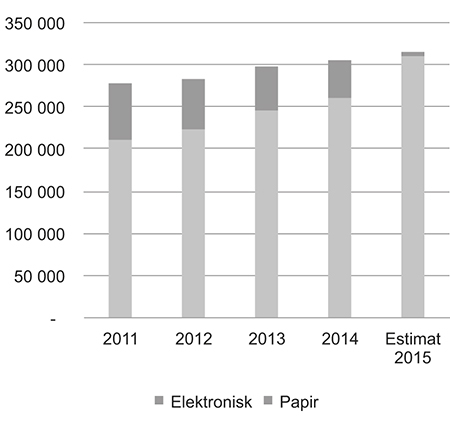 Det er en betydelig økning i antallet digitale offentlige tjenester som tilbys næringsdrivende og privatpersoner gjennom Altinn. I løpet av 2014 var det en økning på 79 elektroniske tjenester, og per januar 2015 er 489 tjenester tilgjengelig i Altinn, jf. fig. 4.3. Blant tjenestene som er lansert i Altinn det siste året er rapportering av lønns- og ansettelsesforhold til Skatteetaten, NAV og Statistisk sentralbyrå (A-meldingen). Om lag 200 000 oppgavepliktige skal levere a-meldingen hver måned. Gjennom integrasjon med bedriftenes egne IKT-systemer og Altinn kan rapporteringen leveres samtidig med bedriftens egne lønnsberegninger. Årlige innsparinger fra tjenesten er anslått til om lag 323 mill. kroner for private arbeidsgivere og 237 mill. kroner for offentlige arbeidsgivere.