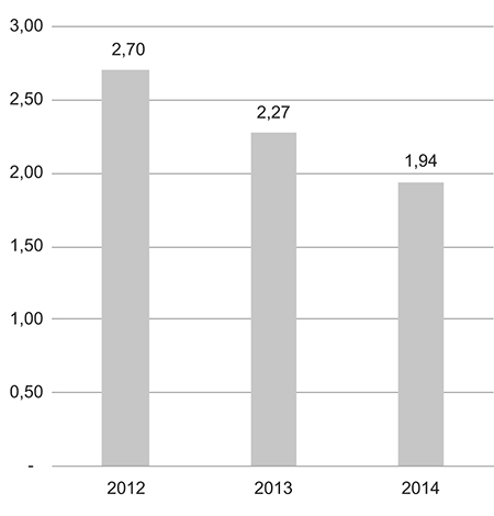 Figur 4.4 Kostnad per transaksjon i Altinn 2012–2014 (kroner)