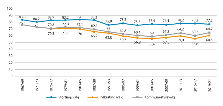 Figur 6.1 Valgdeltakelse ved stortingsvalg, fylkestingsvalg og kommunestyrevalg fra 1967 til 2021.