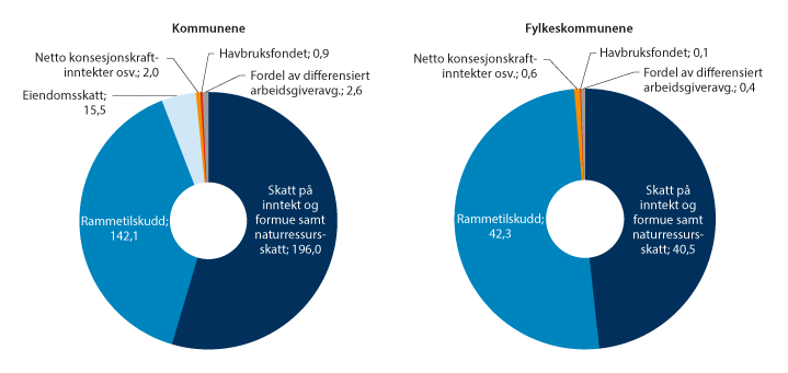 I kommuneopplegget inngår rammetilskudd, skatt på inntekt og formue fra personlige skattytere, naturressursskatt fra kraftforetak samt eiendomsskatt i de frie inntektene. For å få et mest mulig fullstendig bilde av kommunenes frie inntekter, er kommunenes inntekter i analysene vist med og uten netto inntekter fra konsesjonskraft, kraftrettigheter og annen kraft for videresalg, inntekter fra Havbruksfondet og fordelen av differensiert arbeidsgiveravgift, siden dette er inntekter og avgiftslettelse uten føringer for kommunene. Inntektskomponenter som øremerkede tilskudd og gebyrer er ikke med i beregningene. I boks 9.1 beskrives de ulike inntektene nærmere.