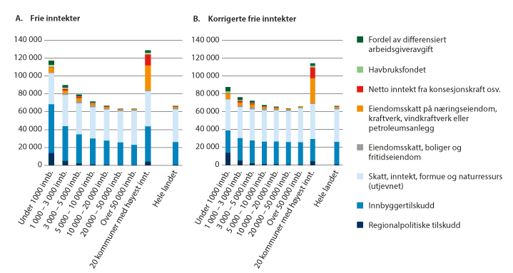 Som vi ser av figuren, bidrar inntekter fra «annen» eiendomsskatt (eiendomsskatt på næringseiendom, vindkraft- og petroleumsanlegg), netto inntekt fra konsesjonskraft, kraftrettigheter og annen kraft for videresalg, inntekter fra Havbruksfondet og fordel av redusert arbeidsgiveravgift til å løfte inntektene per innbygger i kommunegruppen med de aller høyeste inntektene og de minste kommunene vesentlig. Men også uten slike inntekter, det vil si når vi kun ser på inntekter fra rammetilskuddet (innbyggertilskuddet og regionalpolitiske tilskudd) og skatt på inntekt og formue, samt naturressursskatt (som utjevnes i inntektssystemet), har disse kommunene inntekter per innbygger som ligger over landsgjennomsnittet. Dette skyldes blant annet at de minste kommunene gjennomgående har høyere utgiftsbehov enn landsgjennomsnittet, og blir tilført ekstra midler via utgiftsutjevningen i rammetilskuddet. Gjennom utgiftsutjevningen blir kommuner kompensert for ufrivillige kostnader knyttet til innbyggere i ulike aldersgrupper, sosiale forhold, geografi, smådriftsulemper og lignende. Blant annet har alle kommuner noen faste kostnader som dekkes gjennom basistilskuddet. Når dette basistilskuddet deles på et lavt antall innbyggere, blir inntektene per innbygger høye. Disse kommunene mottar også mer i regionalpolitiske tilskudd per innbygger enn landsgjennomsnittet. Grupper med kommuner som har flere enn 5 000 innbyggere, har et nivå på frie inntekter per innbygger som ligger nær landsgjennomsnittet.