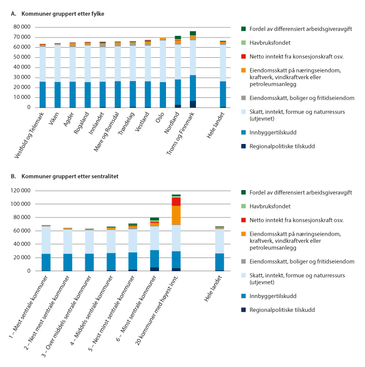 Figur 9.3 viser korrigerte frie inntekter for kommuner gruppert etter henholdsvis fylker og etter sentralitet. Figur 9.3 A viser at kommunene i Troms og Finnmark og i Nordland har de høyeste korrigerte frie inntektene i prosent av landsgjennomsnittet. Dette må ses i sammenheng med både nivået på de regionalpolitiske tilskuddene og fordel av redusert arbeidsgiveravgift. Også Oslo som kommune har korrigerte frie inntekter over landsgjennomsnittet. Dette må ses i sammenheng med høye inntekter fra skatt på inntekt og formue.