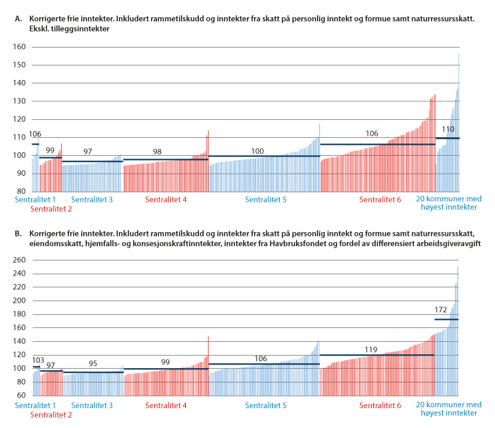I figur 9.4A vises korrigerte frie inntekter per innbygger i prosent av landsgjennomsnittet når en kun vurderer inntekter som er gjenstand for utjevning mellom kommunene, dvs. rammetilskudd og inntekter fra skatt på inntekt og formue, samt naturressursskatt. Figuren viser at kommunene på sentralitet 6 og 1 i gjennomsnitt har det høyeste inntektsnivået, om en ser bort fra de 20 kommunene som har det høyeste inntektsnivået når alle tilleggsinntektene inkluderes. Kommuner på sentralitet 5 har inntekter som landsgjennomsnittet, mens kommuner på sentralitet 2–4 har inntekter under landsgjennomsnittet. På sentralitet 6 har 14 av 96 kommuner frie inntekter under landsgjennomsnittet når kun disse inntektene inkluderes. Landsgjennomsnittet er 100.