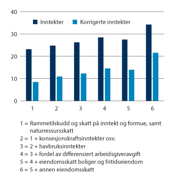 Spredningen mellom kommuner øker stort sett dersom flere tilleggsinntekter inkluderes
