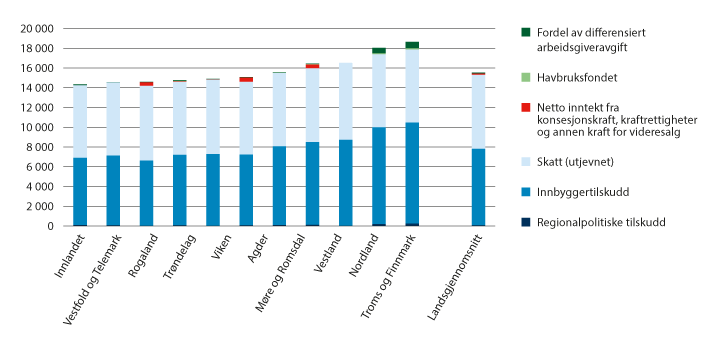 Figuren viser at Troms og Finnmark fylkeskommune har de høyeste korrigerte inntektene, noe som må ses i sammenheng med regionalpolitiske tilskudd, det vil si Nord-Norgetilskuddet, og fordel av differensiert arbeidsgiveravgift. Fylkeskommunene Innlandet, Vestfold og Telemark og Rogaland har de laveste korrigerte frie inntektene.