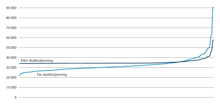 Skatteutjevningen bidro til at kommunen med lavest skatteinntekt per innbygger i 2021 etter utjevning hadde 7 prosent under landsgjennomsnittet i skatteinntekter per innbygger, dvs. rundt 34 000 kroner per innbygger. De aller fleste kommunene ligger på dette skattenivået etter skatteutjevning. Til høyre i figuren er det imidlertid en del kommuner som også etter utjevning får vesentlig mer enn landsgjennomsnittet. Kommunen med høyest skatteinntekter per innbygger etter skatteutjevning lå 59 prosent over landsgjennomsnittet per innbygger, det vil si rundt 58 000 kroner per innbygger.