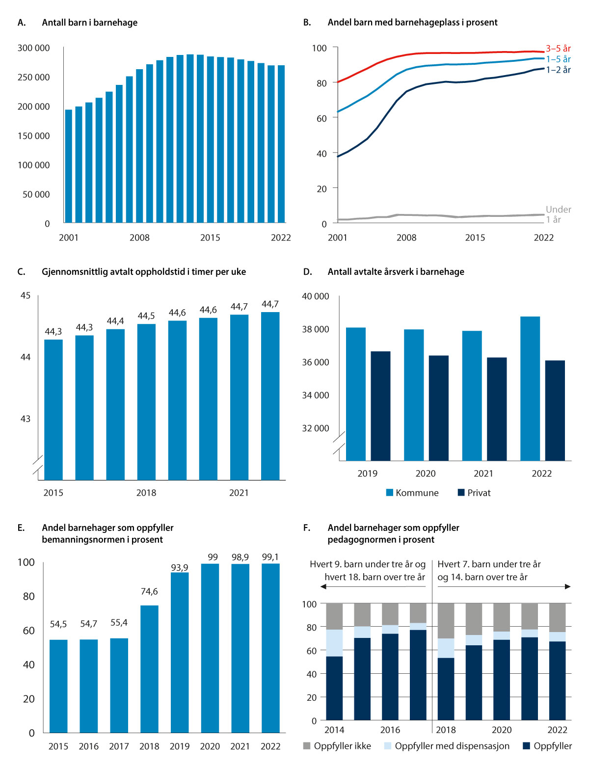 Avtalt, ukentlig oppholdstid per barn med barnehageplass økte med 0,4 timer fra 2015 til 2022, jf. figur 11.1C. I 2021 og 2022 var den avtalte oppholdstiden stabilt på om lag 44,7 timer.