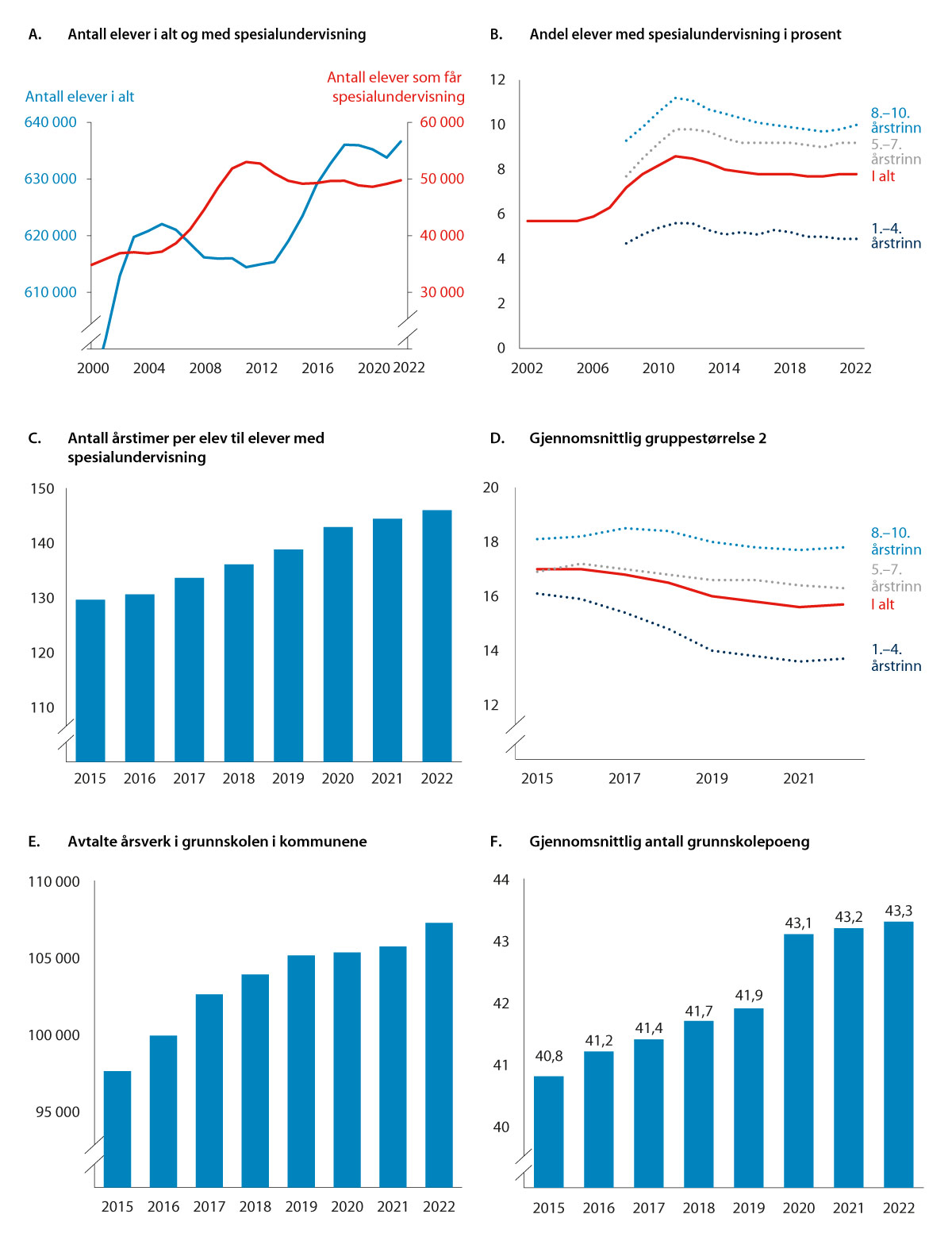 De siste årene har også lærertettheten økt, jf. figur 11.2D. «Gjennomsnittlig gruppestørrelse 2» er en indikator som viser antall elever per lærer i ordinær undervisning, hvor ressurser til spesialundervisning og undervisning i særskilt norskopplæring ikke regnes med. Gjennomsnittlig gruppestørrelse 2 ble redusert fra 17,0 elever i 2015 til 15,7 elever i 2022. Gruppestørrelse 2 viser en liten økning fra 2021 til 2022. Dette gjelder alle trinn med unntak av mellomtrinnet.
