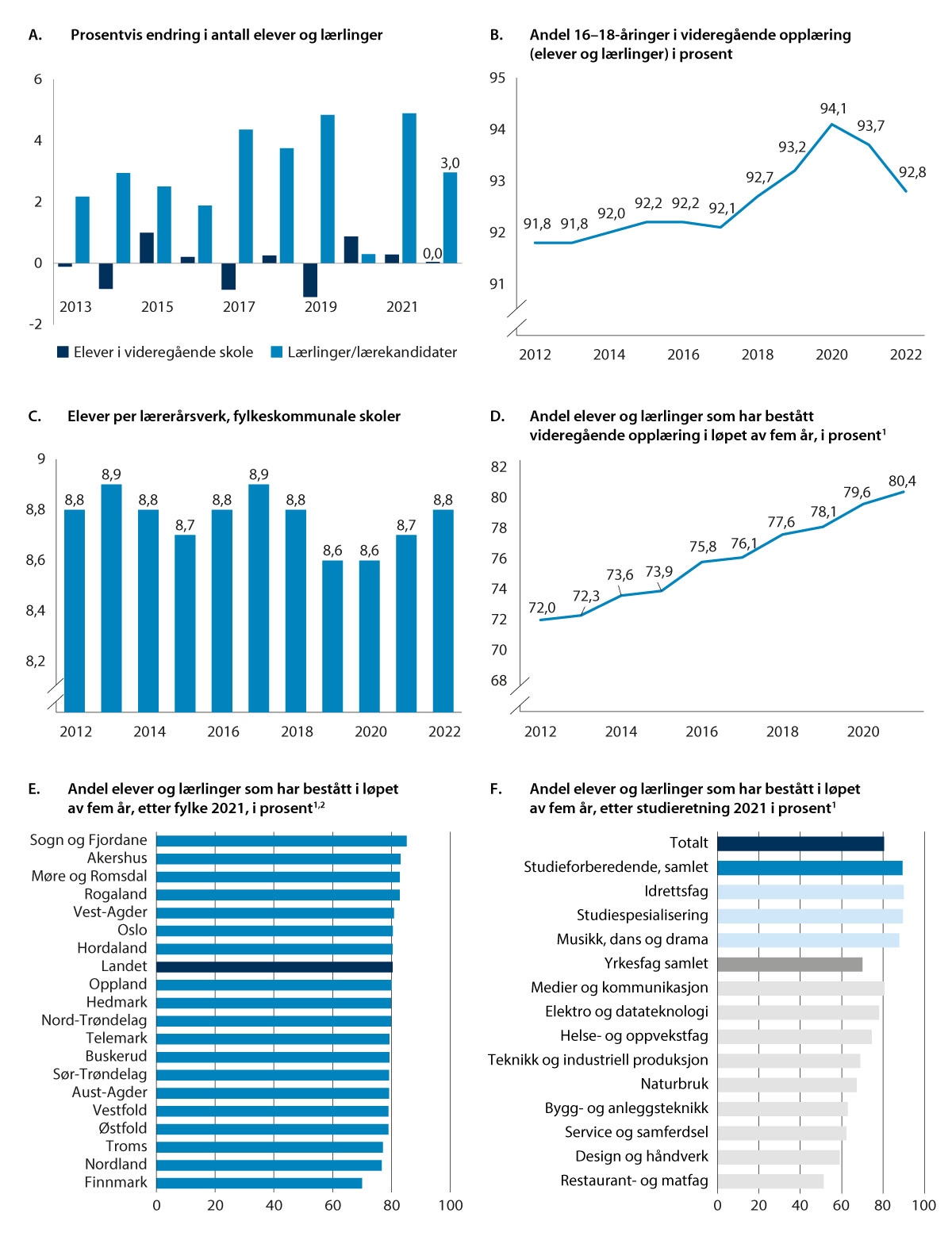 Etter en lengre periode med sterk vekst i elevtallet i videregående opplæring på begynnelsen av 2000-tallet, flatet veksten ut, og siden 2015 har elevtallet vært relativt stabilt. Årskullene ble mindre, men en større andel av 16–18-åringene var i videregående opplæring, og antallet lærlinger og lærekandidater gikk opp fram til 2020, jf. figur 11.3A og B. I 2022 økte befolkningen av 16–18-åringer noe mer enn antallet elever i samme alder. Dette har ført til at andelen av 16–18-åringer i videregående opplæring har gått ned. Veksten i antallet unge i aldersgruppen 16–18 år antas å ha sammenheng med at en del av flyktningene fra Ukraina befinner seg i denne aldersgruppen. Etter en nedgang i andelen av elevene som sluttet i løpet av skoleåret fra 2015, gikk denne andelen opp fra fire til fem prosent fra 2021 til 2022. Dette kan også ha påvirket at andelen som er i videregående opplæring har blitt redusert i 2022.