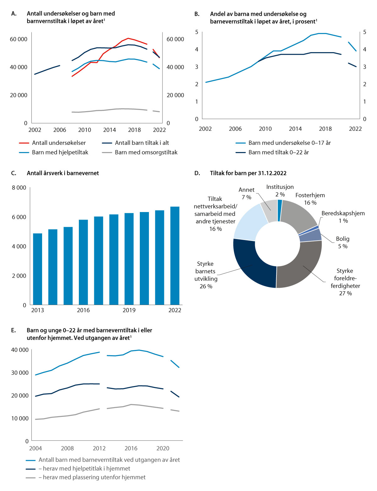 Tallene for barn plassert utenfor hjemmet inkluderer både de barna som barnevernet har overtatt omsorgen for, og barn som er plassert utenfor hjemmet, hvor plasseringen er hjemlet som et hjelpetiltak eller som et akuttvedtak. Ettersom ett barn kan ha flere tiltak og flere plasseringer i løpet av året, er dette kun oppgitt ved utgangen av året. Av de nærmere 32 000 barna med barneverntiltak ved utgangen av 2022, hadde om lag 60 prosent hjelpetiltak i hjemmet, mens om lag 40 prosent var plassert utenfor hjemmet. Over lengre tid var det en sterkere vekst i antall barn som ble plassert utenfor hjemmet, men siden 2015 har andelene vært relativt stabile.
