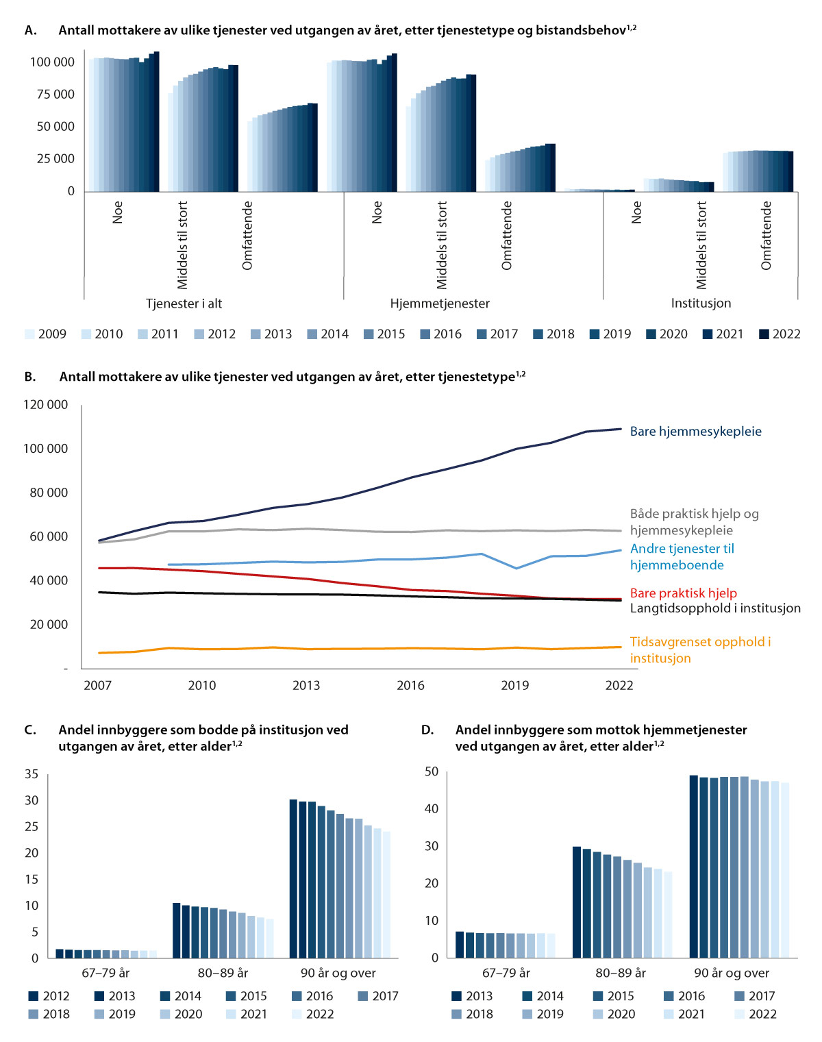I perioden 2015–2022 ser den institusjonsbaserte omsorgen i økende grad ut til å ha blitt forbeholdt dem med størst behov, mens tallet på mottakere med lite eller middels bistandsbehov har gått ned innen den institusjonsbaserte omsorgen, jf. figur 11.5A. Statistikken for mottakere av omsorgstjenester hadde noen svakheter i 2022, jf. fotnotene til figur 11.5, så en må være litt varsom med å tolke resultatene. Samlet sett viser utviklingen over tid en betydelig endring i hvilke grupper som mottar hjemmetjenester. Den gjennomsnittlige pleietyngden per tjenestemottaker økte både for institusjonsbasert omsorg og for hjemmetjenesten fram til 2021. Innen hjemmetjenestene økte gjennomsnittlig bistandsbehov per mottaker fra 8,9 timer i uka i 2015 til 9,8 timer i 2022.
