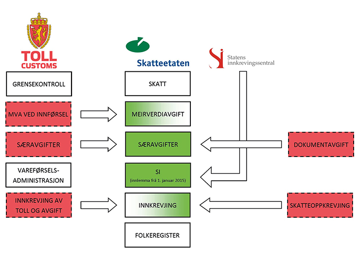 Dagens organisering av skatte- og avgiftsadministrasjonen er eit resultat av ei lang utvikling, og har meir historiske årsaker enn reint faglege. Dei ulike etatane på området har arbeidd godt innanfor dagens organisering, men utviklinga og oppgåvefordelinga mellom dei har ikkje i tilstrekkeleg grad blitt sett i samanheng. Dette har ført til ei lite tenlig oppsplitting av arbeidsoppgåver som mellom anna hindrar fagleg samordning og heller ikkje fremjar effektivitet i sakshandsaminga. Det har blitt gjennomført fleire utgreiingar som har vist at betre samordning av dette området vil kunne frigjere ressursar, forbetre arbeidsprosessar og redusere kostnadene ved IKT-utvikling. I 2014 foreslo derfor Regjeringa fleire tiltak for å gjere skatte- og avgiftsforvaltninga betre, meir effektiv og meir samordna, jf. omtale i Prop. 93 S (2013–2014) og Prop. 1 S (2014–2015). I handsaminga av statsbudsjettet for 2015 slutta eit fleirtal på Stortinget seg til intensjonen om at Toll- og avgiftsetaten reindyrkas til grensekontroll og vareførsel, medan intensjonen for Skatteetaten er å ha ansvar for forvaltning av skatt og avgift. Eit av tiltaka, overføring av Statens innkrevjingssentral til Skatteetaten, er allereie gjennomført. Dei øvrige tiltaka vil gjennomførast i perioden 2015–2017.