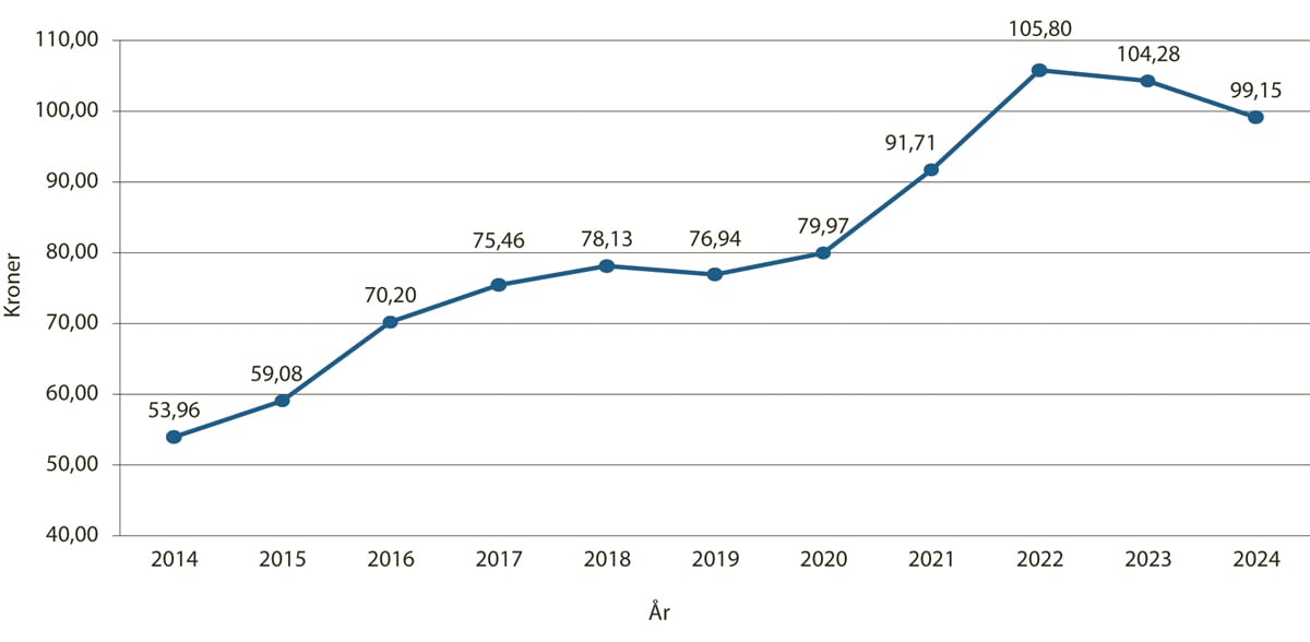 Tabell 5.1 viser et sammendrag av Totalregnskapet for årene 2020 til 2023, og budsjett for 2024. Totalregnskapet for 2023 viser en reduksjon i resultatmålene fra 2022 til 2023. Årsresultatet reduseres fra 175,2 mill. kroner i 2022 til 163,5 mill. kroner i 2023 (-11,7 mill. kroner). Årsresultatet per årsverk reduseres fra 182 282 kroner i 2022 til 171 622 kroner i 2023. Målt per siidaandel reduseres årsresultatet fra 311 674 kroner i 2022 til 291 429 kroner i 2023.