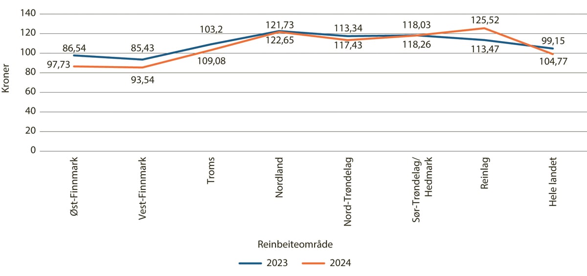 Variasjoner i reintallet fra år til år, sammenholdt med priser og gjennomsnittsvekter, skaper endringer i samlet livdyrverdi. For 2023 gir dette en reduksjon i livdyrverdien på 1,8 mill. kroner sammenlignet med 2022.