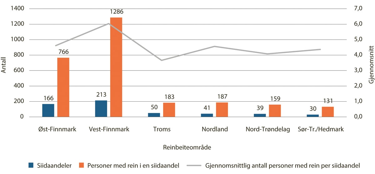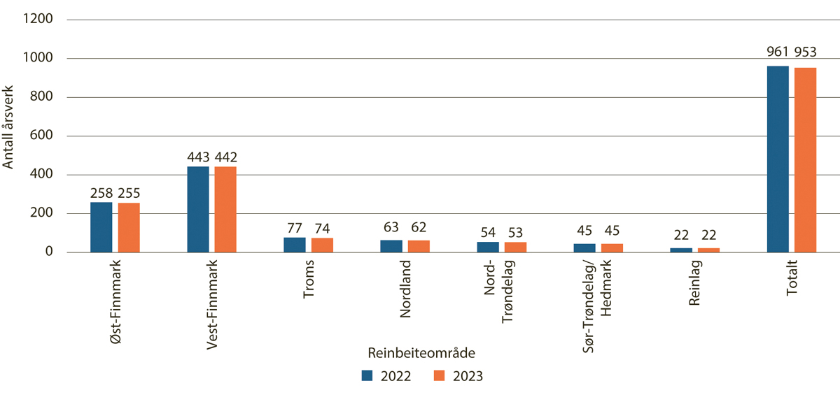 Figur 5.23 Antall årsverk i reindriften, per reinbeiteområde, 2022–2023