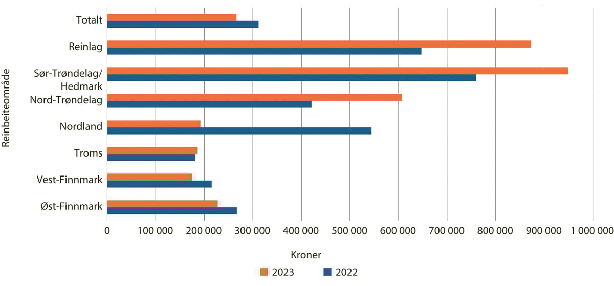 Erstatningene for tap av rein reduseres fra 97,8 mill. kroner i 2022 til 91,9 mill. kroner i 2023 (-5,8 mill. kroner), og erstatningene for arealinngrep øker fra 10,4 mill. kroner i 2022 til 14,2 mill. kroner i 2023 (+3,8 mill. kroner).