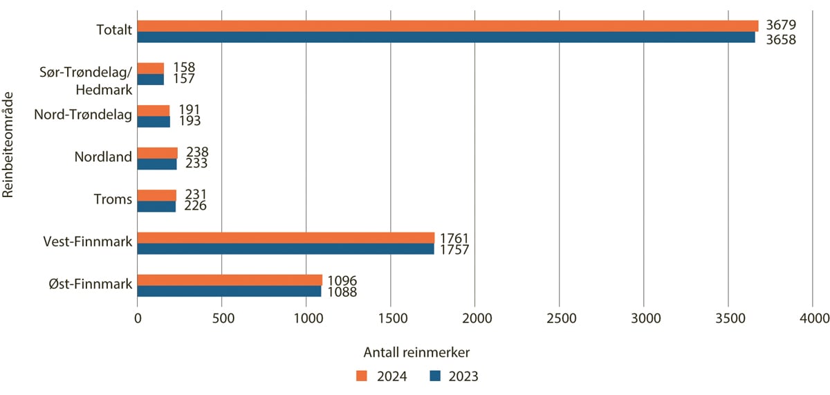 Figur 5.24 Antall registrerte og aktive merker, per reinbeiteområde, 2023–2024