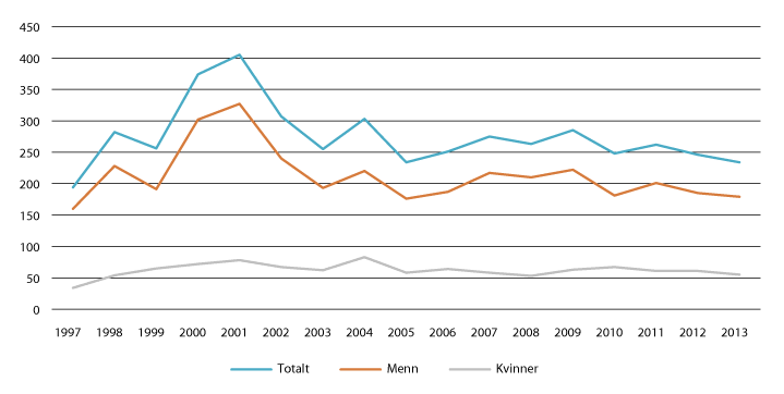 Bruk av amfetaminer, kokain og andre narkotiske stoffer unntatt opioider, forårsaker få dødsfall, men hyppig og risikofylt bruk fører til personlige, sosiale og helsemessige problemer. Antall personer som injiserer narkotika, hovedsakelig opioider, har vist en stabil eller noe nedadgående trend fra 2008. I 2012 ble antallet beregnet til om lag 8 400 personer. I 2013 ble det registrert 234 narkotikautløste dødsfall i Norge. 76 pst. av disse var menn. Antallet dødsfall har vært noenlunde stabilt siden 2002 med et gjennomsnitt på 266 døde årlig. Antall dødsfall i 2013 var imidlertid lavere enn i perioden 2009–2012. Samlet sett har vi hatt en nedadgående trend siden 2009.