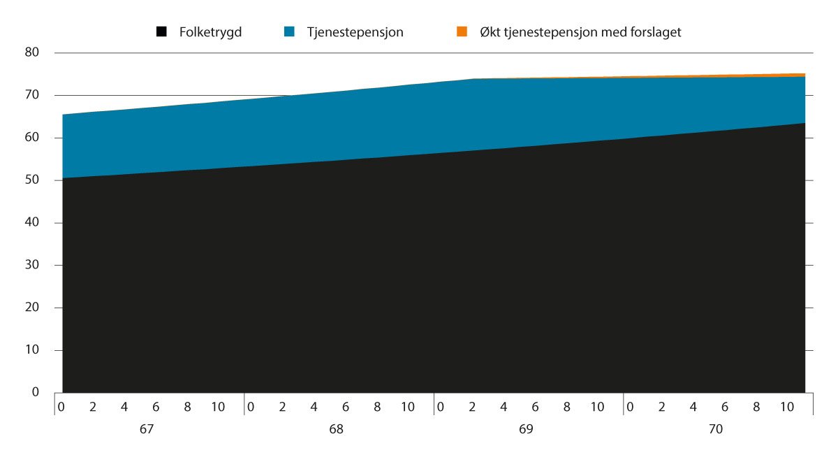 For de som tar ut folketrygden før de slutter i jobb, for eksempel ved 67 år, vil samlet kompensasjonsgrad bli lavere enn det som går fram av figur 5.3, figur 5.4 og figur 5.5. Dette skyldes at folketrygden i liten grad endres ved utsatt avgang. Tjenestepensjonen påvirkes ikke av tidspunktet for uttak av alderspensjon fra folketrygden, men samlet årlig pensjon blir lavere når folketrygden tas ut før tjenestepensjonen.