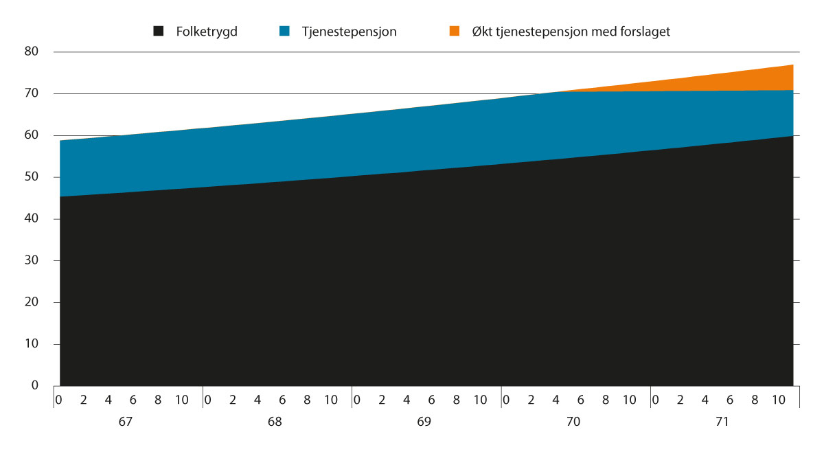 Med forslaget vil tjenestepensjonen reduseres mindre ved utsatt uttak etter at det fullt ut er kompensert for effekten av levealdersjusteringen, enn det som følger av gjeldende regler, og i større grad for de yngste årskullene enn de eldste.