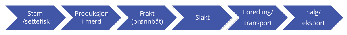 Når fisken er ferdig utvokst, hentes den fra merdene i sjøen og fraktes med brønnbåt til et slakteanlegg på land. Der blir den bedøvet og bløgget før den deretter blir sløyet og vasket. Etter slakt eksporteres det meste av fisken, men noe blir også bearbeidet i Norge. Verdikjeden er oppsummert i figur 2.3.