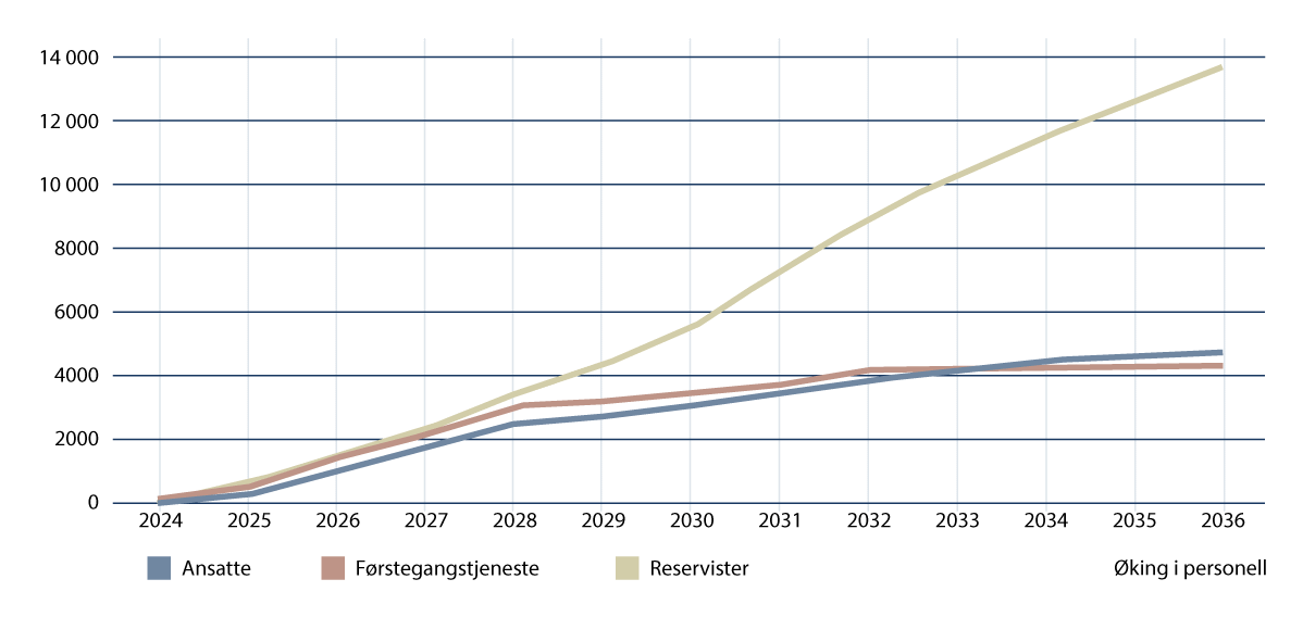Styrkingen av forsvarssektoren vil kreve en kraftig bemanningsvekst i de kommende årene. Forsvarssektoren skal styrkes med om lag 4600 ansatte, 4600 vernepliktige og 13 700 reservister frem mot 2036