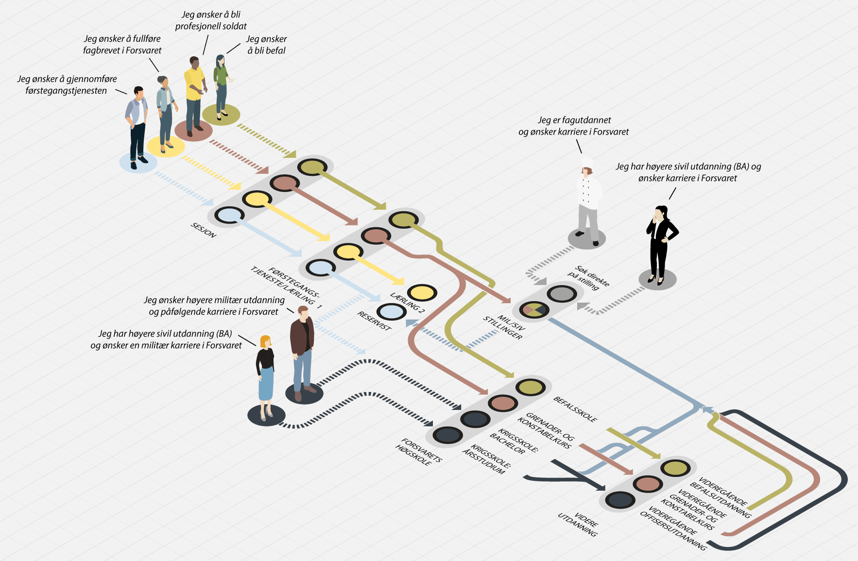 Figur 7.2 Det finnes mange veier inn i Forsvaret. Denne figuren gir en oversikt over de ulike veiene til en karriere i Forsvaret.