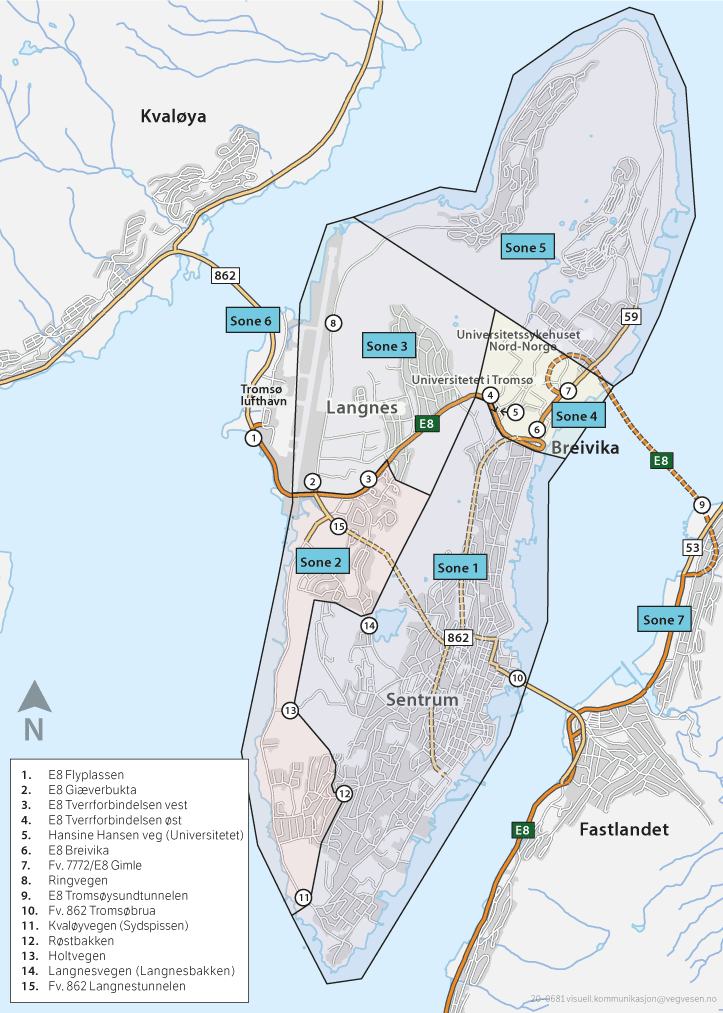 Figur 6.1 Soneinndeling og plassering av bomstasjonar.