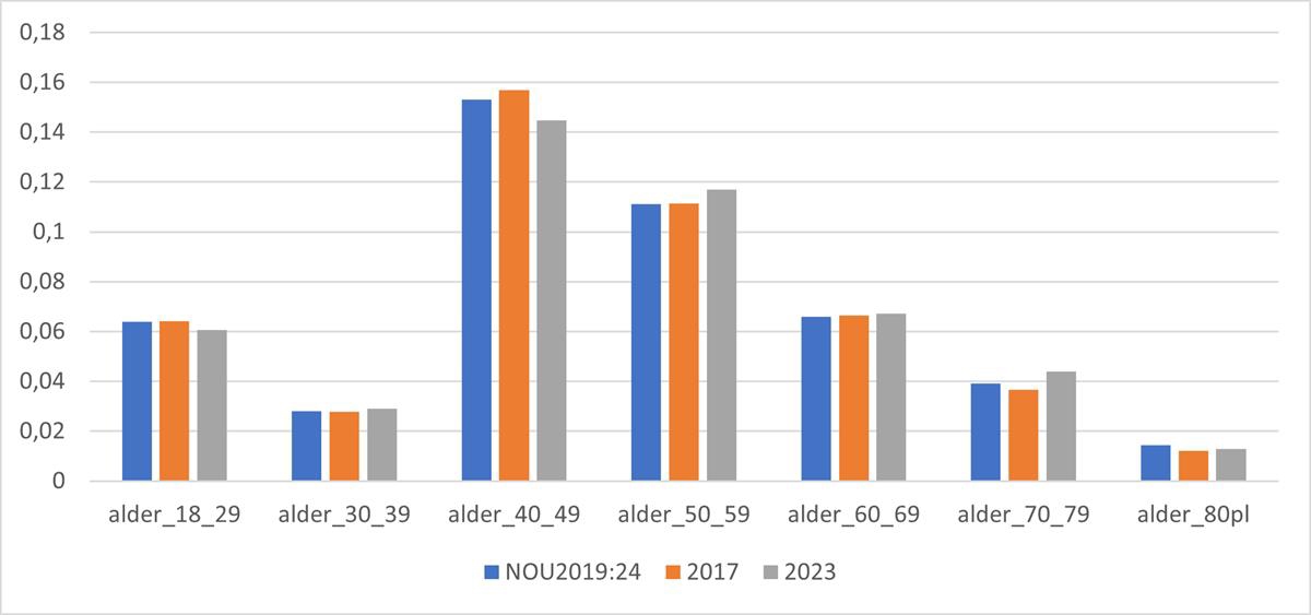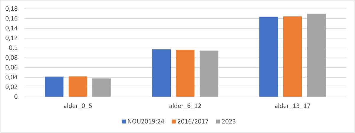 På grunn av dette har jeg oppdatert med både 2016/2017 og 2023, slik at den endringen som bør ses på er endringen fra 2016/2017 til 2023, og ikke fra NOU 2019: 24.