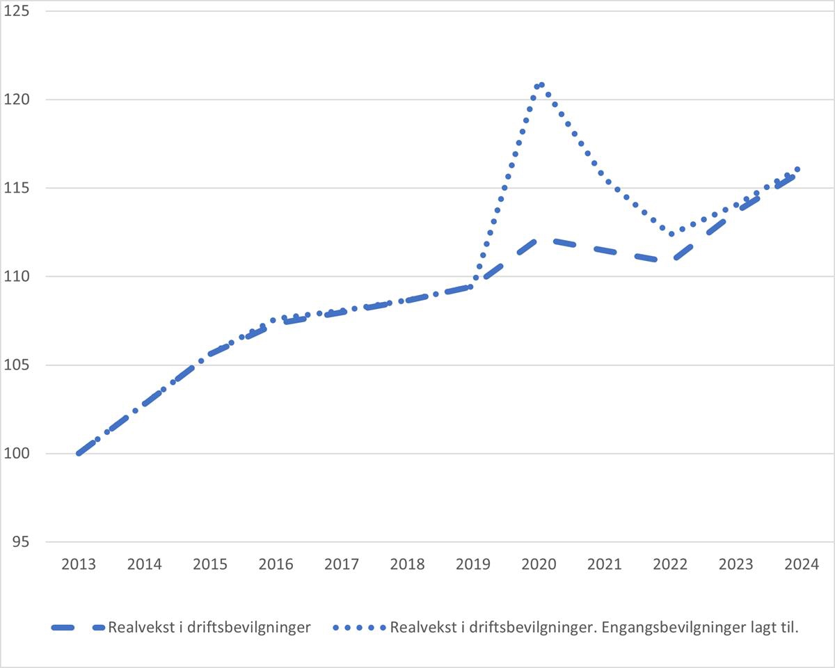 Figur 3.1 Realvekst i driftsbevilgninger og Realvekst i driftsbevilgninger. Engangsbevilgninger lagt til. 2013=100. Mrd. 2024-kroner. 2013 til 2024.