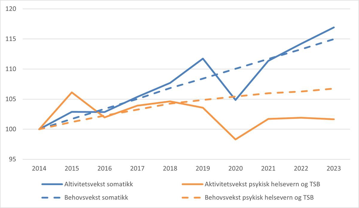 Som omtalt i kapittel 4 utarbeider Helsedirektoratet beregninger av demografisk betinget behovsvekst for spesialisthelsetjenesten. Akkumulert beregnet behovsvekst for somatikk, psykisk helsevern og TSB for spesialisthelsetjenesten fra 2014 til 2023 framgår også av figur 5.1.