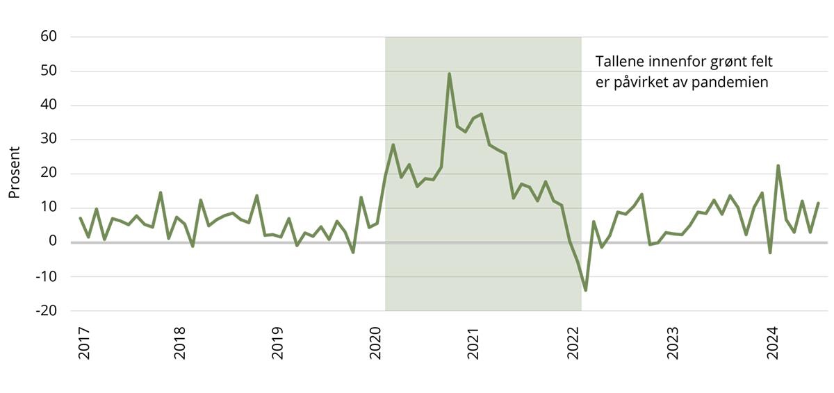 Figur 3.6 Endring i varehandelsindeksen for postordrehandel og handel via internett (2017–2024) siste 12 mnd.
