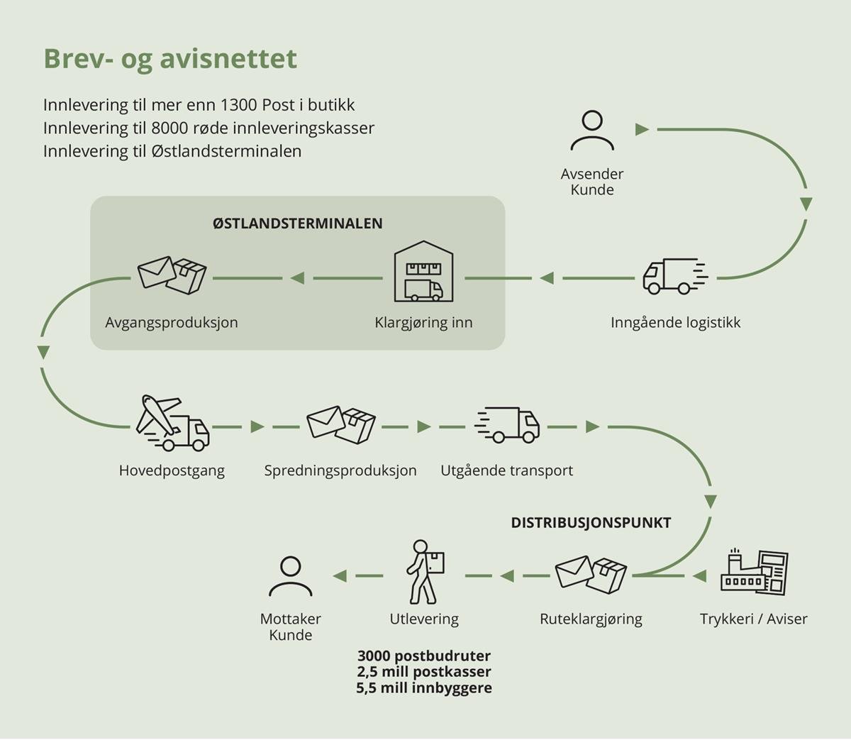 Posten er eneste landsdekkende distributør med postkasselevering av brev og aviser i ukedagene til alle landets 2,5 mill. husstander. Brevdistribusjon er en kompleks og sammenhengende kjede fra innlevering til utlevering.