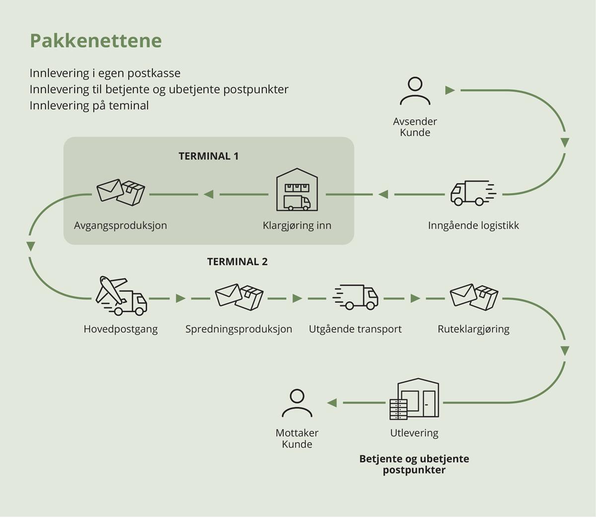 Posten, PostNord og Helthjem sorterer pakkesendinger på flere terminaler rundt om i landet. I tillegg har noen av de internasjonale pakke- og logistikkaktørene egne pakketerminaler på Gardermoen.