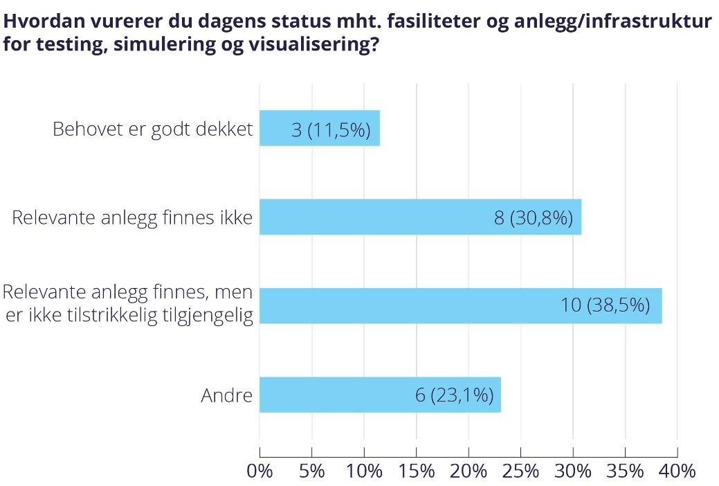 På oppdrag fra Samferdselsdepartementet har DNV-GL gjennomført en undersøkelse mot bedriftsmiljøer med mulig stor/fullskala testbehov. Bedriftene som svarte på undersøkelsen bekrefter tanken om at storskala/fullskala testing ved bruk av sjøarealer er relevant for industrien, og at flere vurderer eksisterende tilbud på dette feltet som fraværende (Figur 10.1) (DNV GL, 2016). I løpet av utredningen har mange aktører særlig vektlagt mulighetene knyttet til en testfasilitet. De samme signalene er gitt både fra bedriftene og forskningsmiljøene ved Norges arktiske universitet (UiT) og NORD universitet: En testfasilitet er ikke nødvendigvis svaret på en konkret eksisterende etterspørsel i industri og FoU-miljøene, men har potensial for å løse ut ny aktivitet og verdiskaping.