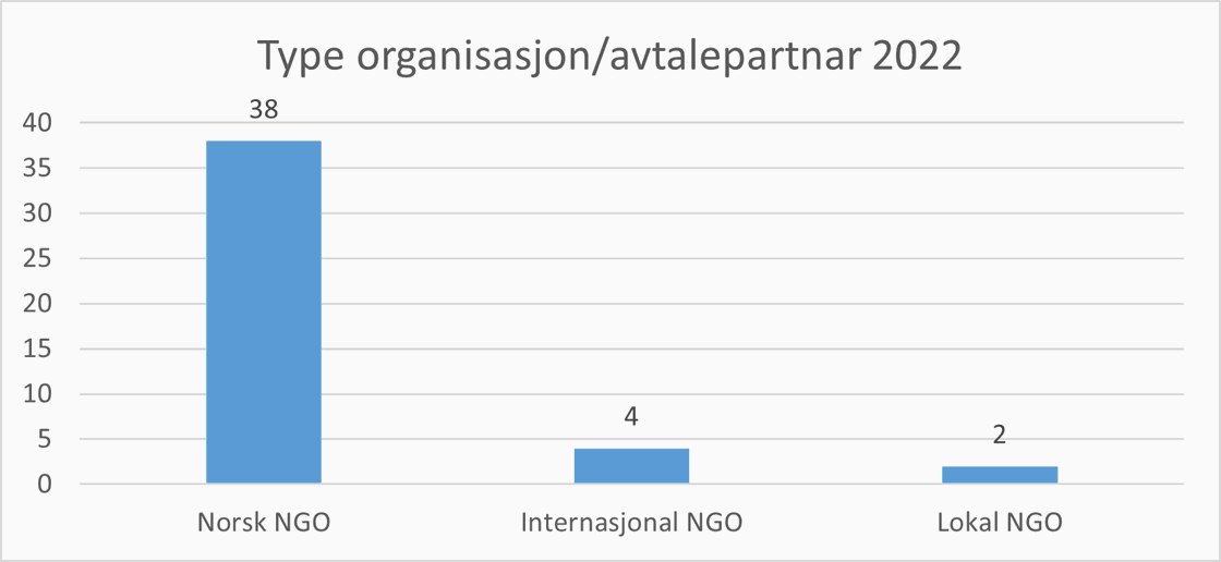 38 av dei 44 sakene med reaksjon i 2022 knyter seg til norske ikkje-statlege organisasjonar (NGO-ar). I dei aller fleste av desse sakene fann misleghaldet stad hos organisasjonen sin eigen lokale partnar. Fire saker var knytte til internasjonale NGO-ar, og to til lokale NGO-ar som var direkte avtalepartnarar.