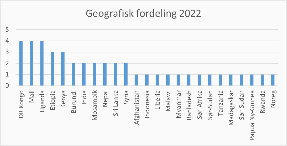 DR Kongo, Mali og Uganda er dei landa som har flest saker med reaksjon i 2022, med fire saker kvar. Talet på saker per land kan variere sterkt frå år til år.