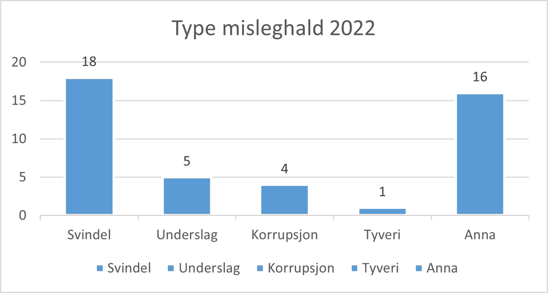 Dei enkelte misleghaldssakene er ofte samansette og kan innehalde fleire ulike element av misleghald. Ei grovkategorisering viser at 18 av dei 44 sakene med reaksjon i 2022, dreier seg om svindel (til dømes manipulering av rekneskap), fem dreier seg om underslag, fire om korrupsjon og ei om tjuveri. I kategorien «Anna» finn ein manglande rapportering, udokumenterte kostnader, midlar som er brukte til noko anna enn det avtalte føremålet, osb. Det var 16 saker i denne kategorien i 2022.