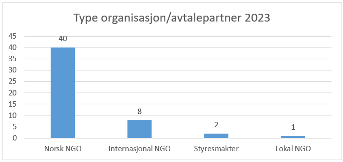 40 av dei 51 sakene med reaksjon i 2023 knyter seg til norske ikkje-statlege organisasjonar (NGO-ar) og åtte til internasjonale NGO-ar. I dei aller fleste av desse sakene fann misleghaldet stad hos organisasjonen sin eigen lokale partnar eller i organisasjonens eiget lokale kontor. To sakar skjedde hos lokale styresmakter og éin hos ein lokal NGO som var direkte avtalepartnar.