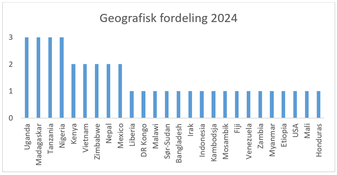 Uganda, Madagaskar, Tanzania og Nigeria er landa som har flest saker med reaksjon i 2024. Talet på saker per land kan variere sterkt frå år til år.