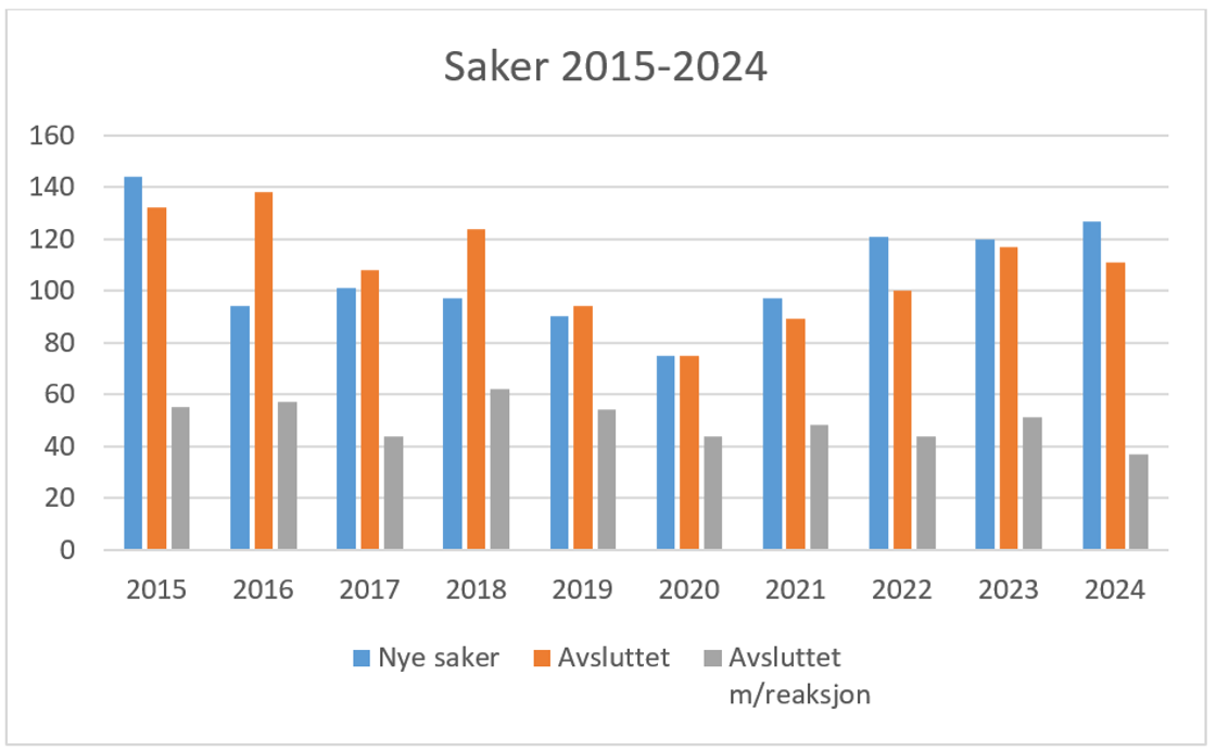Talet på nye saker fall i perioden 2015–2020, men har sidan stige. Det er vanskeleg å trekkje nokre slutningar om kva som er årsaka til auken. Terskelen for å registrere saker som misleghaldssaker, vil truleg medverke til kor mange saker som vert registrerte. Det kan òg konstaterast ein nedgang under pandemien, og at talet på saker deretter har vore stigande. Frå 2022 omfattar tala òg nokre av dei sakene som er registrerte i Utanriksdepartementet om seksuell utnytting, misbruk og trakassering (sjå 5.). Det er naturleg at talet på saker vil variere frå år til år, og nedgang eller oppgang gjev ikkje grunnlag for å trekkje klare slutningar om andre typar årsaker.