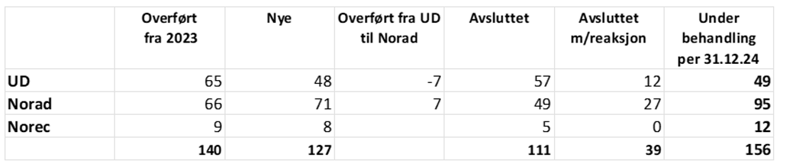 I 2024 registrerte Sentral kontrolleining 127 nye saker. I den same perioden vart 111 saker avslutta. Av desse vart 39 avslutta med reaksjon, og alle desse var knytte til programområde 03 Internasjonal bistand. Det vart betalt tilbake om lag 7,8 millionar kroner. Under visse vilkår kan tap som følgje av misleghald dekkjast ved at tilskotsmottakarane betalar tilbake det aktuelle beløpet til prosjektet. Av dei 39 sakene med reaksjon var det ti slike saker i 2024, med eit samla beløp på om lag 1 million kroner.
