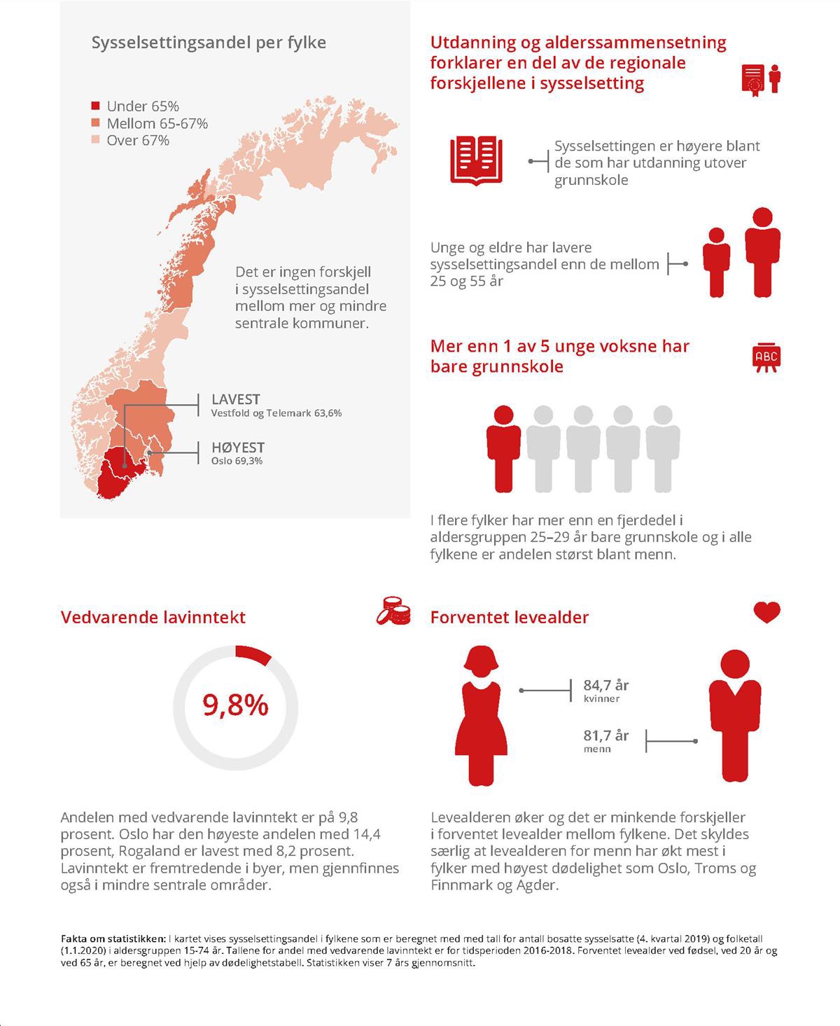 På landsbasis var andelen personer i husholdninger med vedvarende lavinntekt på 9,8 prosent i perioden 2016–2018. Det er en viss sammenheng mellom en kommunes og fylkes gjennomsnittsinntekt og lavinntektsandel, jf. tabell 5.5. Fylker som Innlandet, Agder og Vestfold og Telemark med relativ lav gjennomsnittsinntekt har også noe høyere andel av befolkningen i husholdninger med lavinntekt. Oslo skiller seg markant fra dette bildet både blant fylker og kommuner med både en høy gjennomsnittsinntekt og høy andel med lavinntekt. Vestlandsfylkene har relativt lav andel lavinntekt og høy gjennomsnittsinntekt. Også i de nordnorske fylkene er andelen med lavinntekt lav.