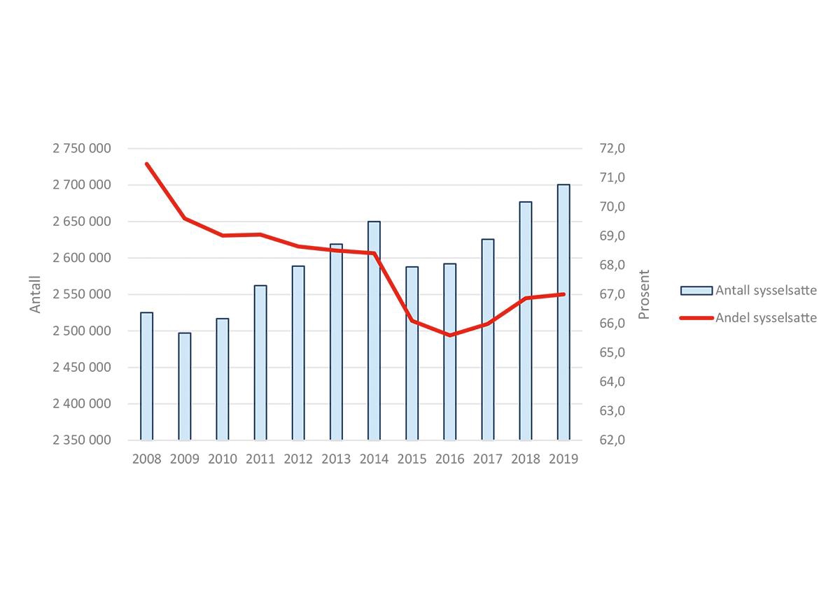 Figur 5.1 Antall og andel sysselsatte (15–74 år) i Norge 2008–2019. Tall i antall personer og prosent.