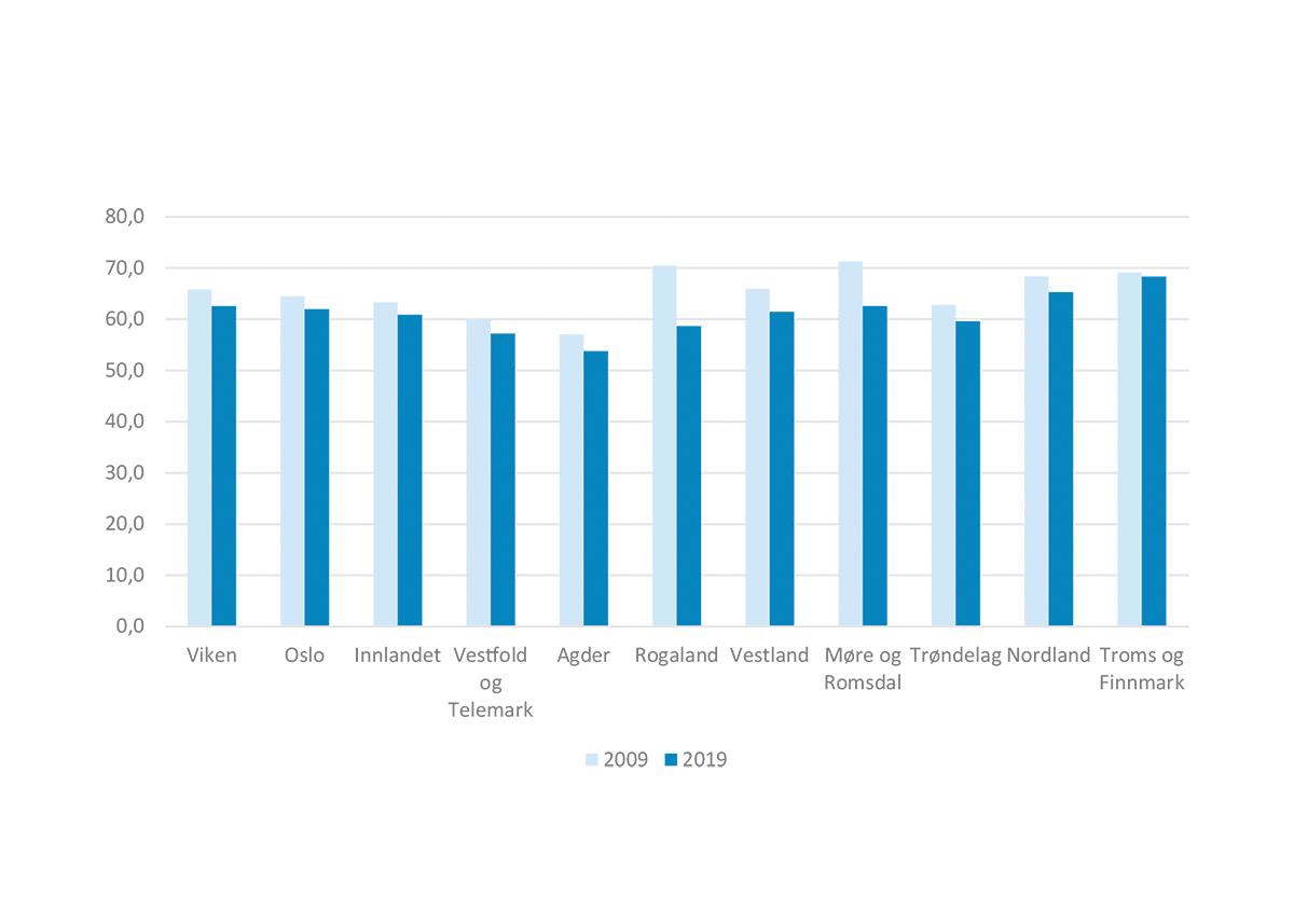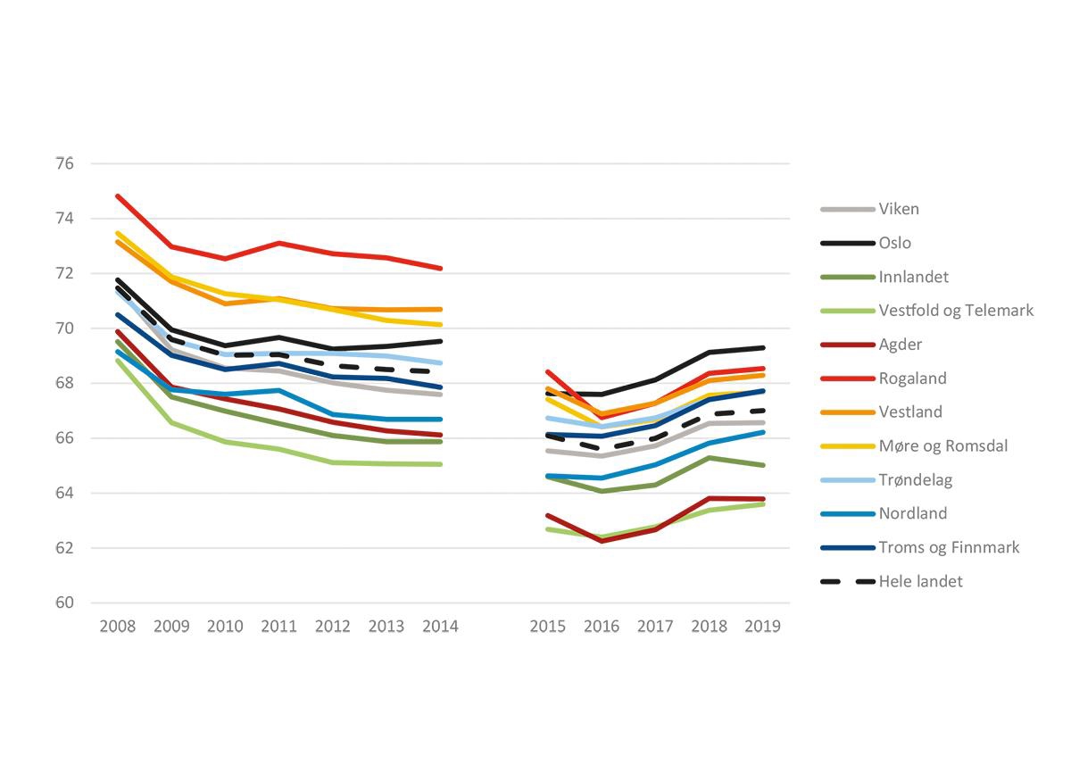 Troms og Finnmark | 71,3 | 67,7 | 66,9 | 63,3 | 67,7 | ||