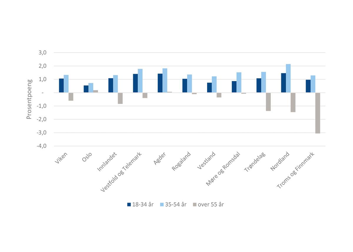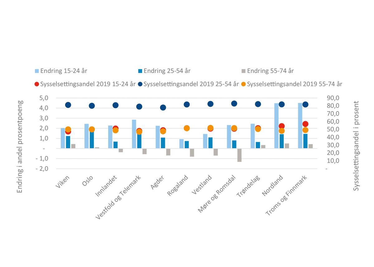 Fylker med en høy andel eldre, som Nordland, Innlandet, Vestfold og Telemark og Møre og Romsdal opplever den største økningen, mens Oslos andel reduseres betraktelig. Dette kommer av at Oslo har en stor andel av sin befolkning i spennet mellom 25–54 år (64 prosent), som er den aldersgruppen der sysselsettingsandelen er høyest.