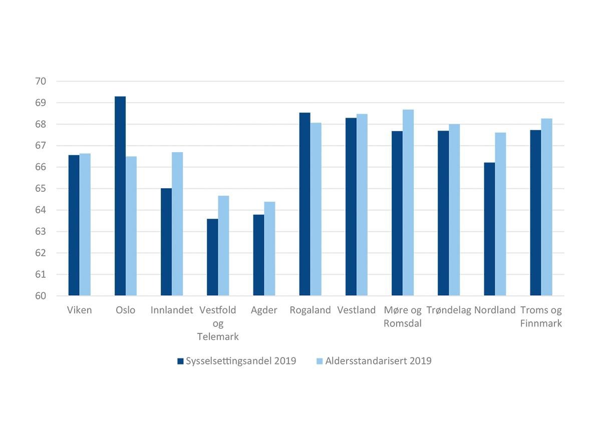 Hvis vi aldersstandardiserer19 fylkenes sysselsettingsandel, ser vi at en del av de regionale forskjellene skyldes ulik alderssammensetning i befolkningen, jf. figur 5.5 , og forskjellen mellom fylket med høyest og lavest andel reduseres fra 6 til om lag 4 prosentpoeng.